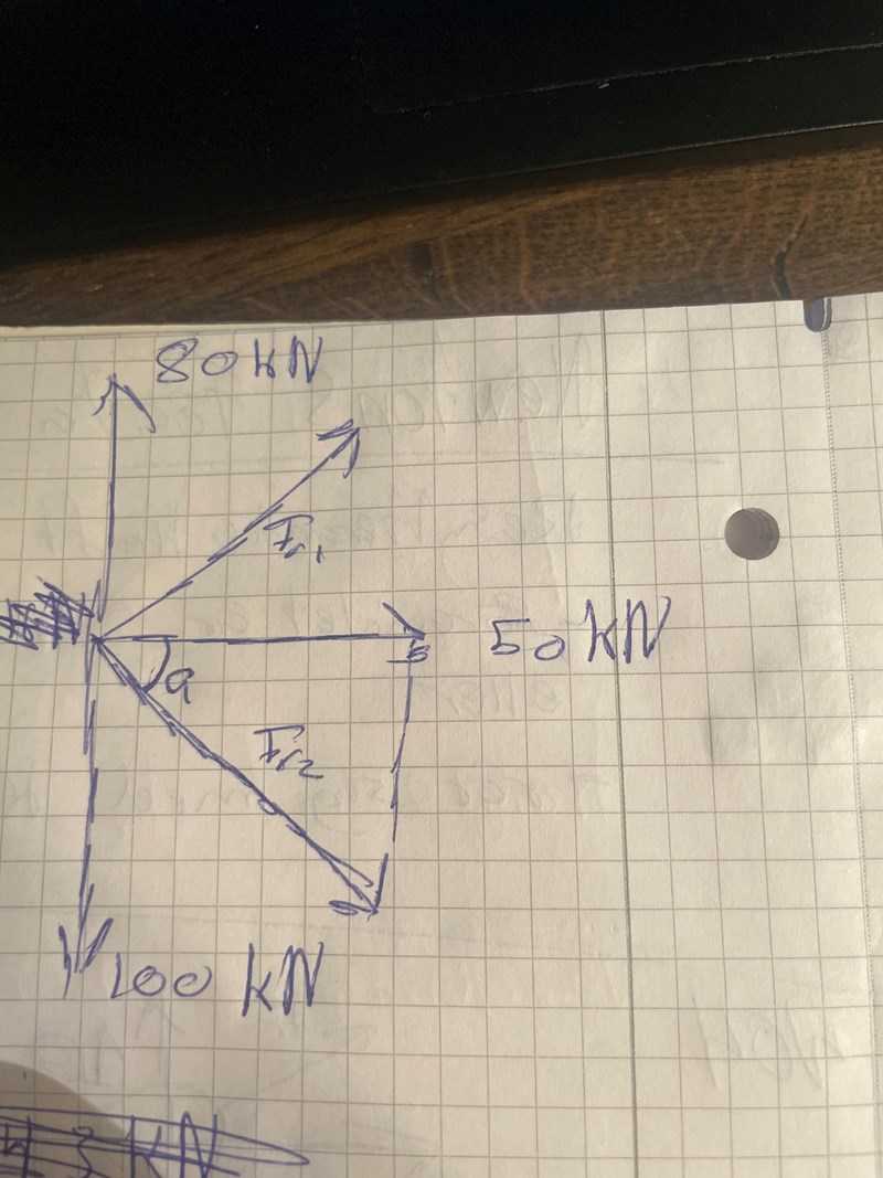 Jag har ritat ut den på mitt papper o beräkna resulterande kraften mellan 80 och 50. Och vid 100 och 50 sedan subtraherade jag dessa två FR med varandra och använda differensen som hypotenusan för att nu beräkna vinkeln. Jag fick dock fel svar och jag vet inte vad jag ska göra nu jag skulle helst vilja förstå hur uppgiften ska lösas o inte bara få svaret, tack.