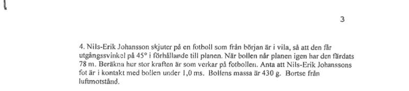 Jaha okej men då förstår jag. Jag provar och räknar ut den tiden det tar för bollen att färdas 78 m i x-led. Men problemet är att vi ej har någon aning om utgångshastigheten, säg att vi använder s=v0y*t-gt^2/2. Om s är sträckan i y-led som bollen får när den kommit ned på planen vilket jag tänker är 0 så har vi helt plötsligt två obekanta dvs tiden och v0y.