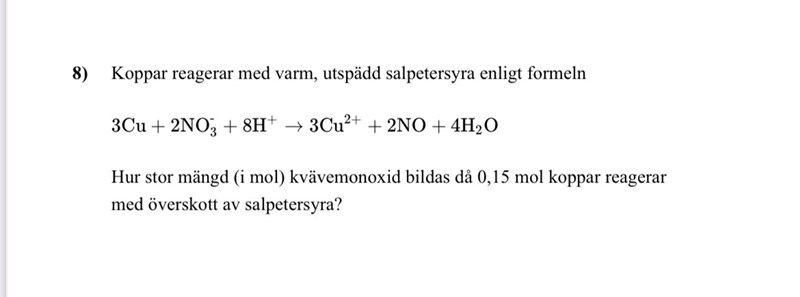 Jag håller på med denna fråga som du ser nedan. Jag vet inte riktigt hur jag ska gå tillväga för att lösa uppgiften. Jag har räknat ut hur mycket gram (m) och 0,15 mol Cu är, vilket var 9,5319 gram, och dess molmassa är 63,546. Men jag vet inte riktigt hur jag ska ha nytta av denna information. Jag skulle verkligen uppskatta om någon skulle vilja förklara hur jag löser denna uppgift. Tack på förhand!