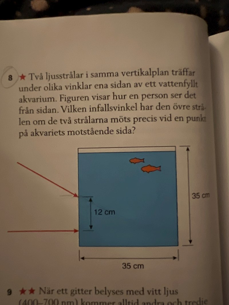 Yngve skrev:Rita de båda strålarnas fortsatta strålgång i akvariet. De ska mötas vid en punkt på den högra väggen.