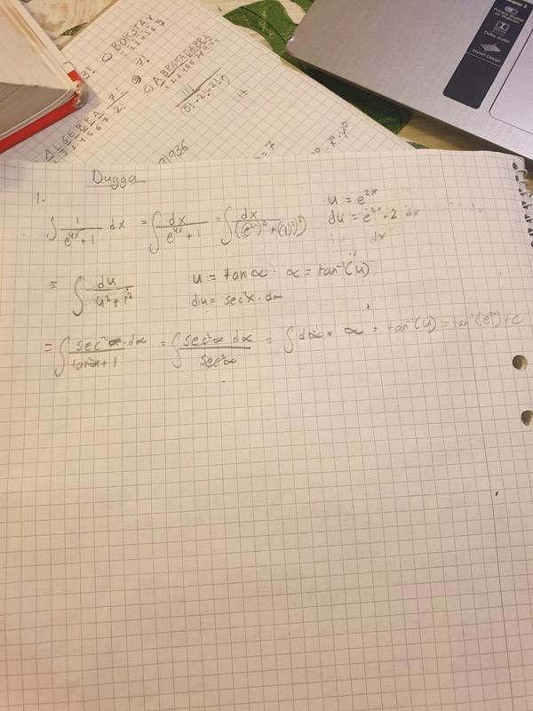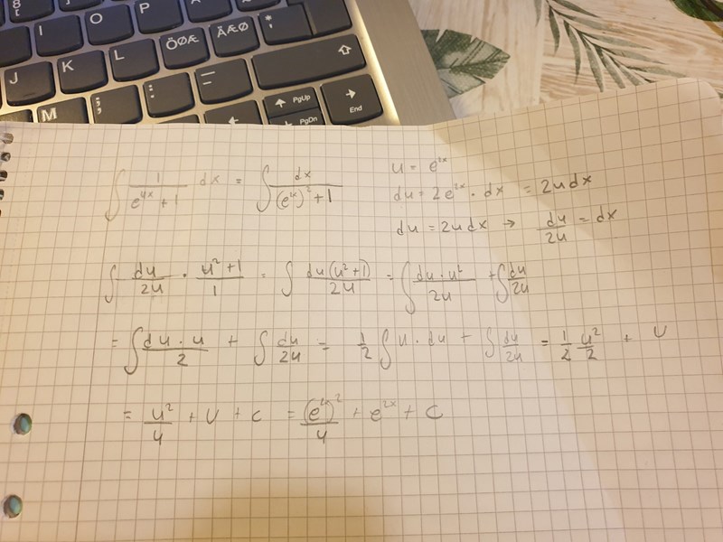 Du fick fram ett uttryck för du som funktion av dx. Sedan tycks du i nästa steg ersätta x:n med u:n och dx med du utan att ha med uttrycket framför dx, e2x*2( vilket även är u*2).