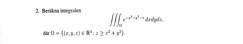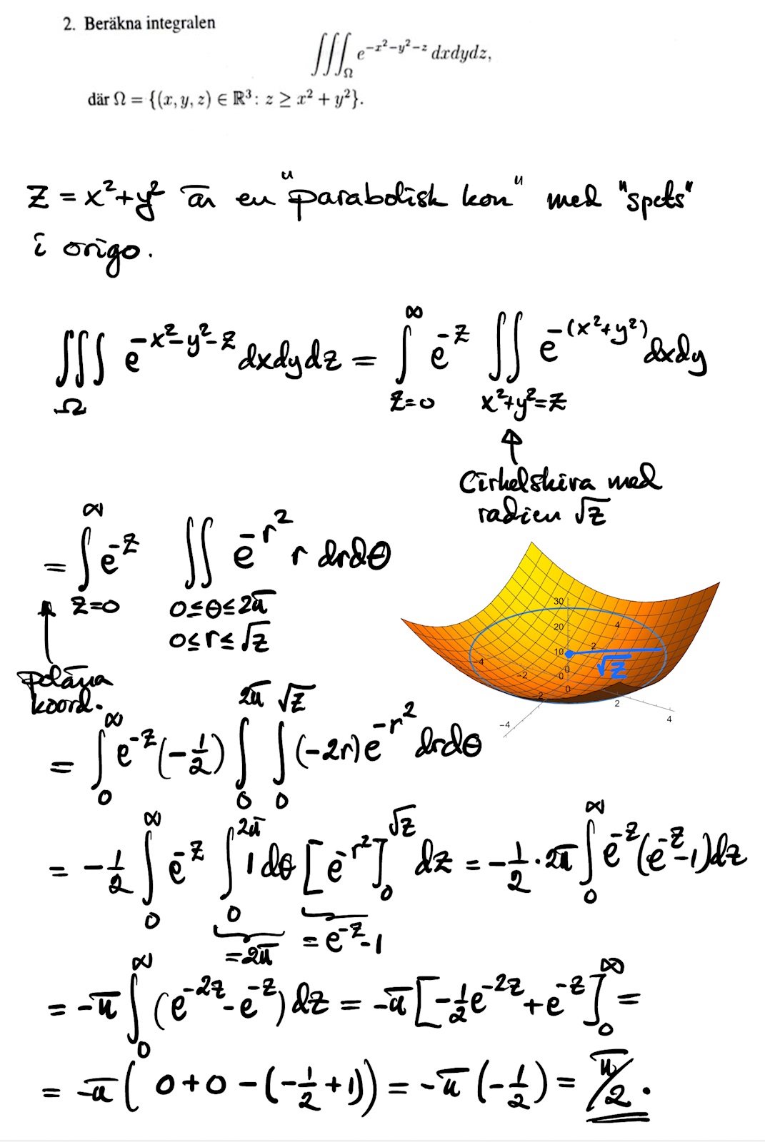 Jaha paraboloider är alltså cirkelskivor. Som du ritade så är det väl någon cirkel inuti med radien sqrt(z) så jag tänkte ändå införa polära koordinater. Sen förstår jag inte vad du menar att jag ska ändra. Men jag förstår iaf lösningen. Det är samma lösningsförslag som facit.