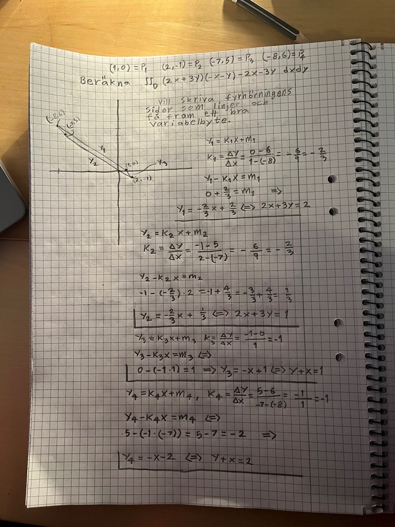 Jag har tänkte så här: jag ritade fyrhörningen i ett koordinatsystem och sedan beskrev jag varje sida hos fyrhörningen som en linje, eftersom jag vet att det i en del fall är ett bra knep för att få fram ett passande variabelbyte.