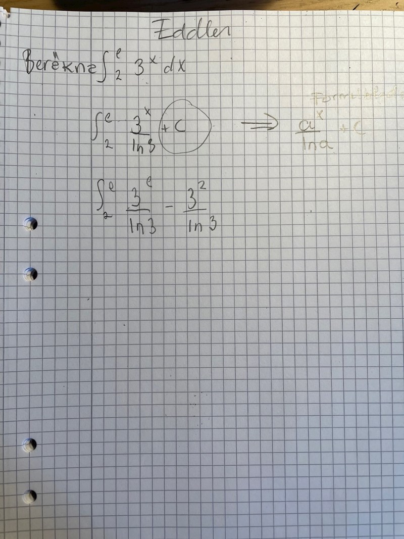 Hej, i denna uppgift där man ska beräkna integralen har jag gjort enligt bilden och från formelsamlingen framgår integrering av ax och jag undrar var C tar vägen?