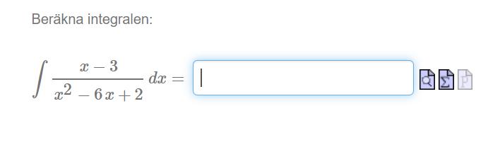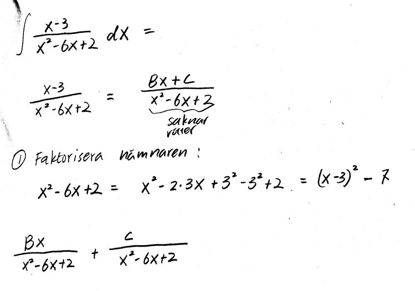Marcus N skrev:Tomten skrev:Du skriver att nämnaren n(x)= x2 -6x+2 saknar rötter och får krångel. Men n(3)=-2 och n(10)=42 och n(x) är kontinuerlig i hela R medför att den måste ha minst ett nollställe. Kör pq.