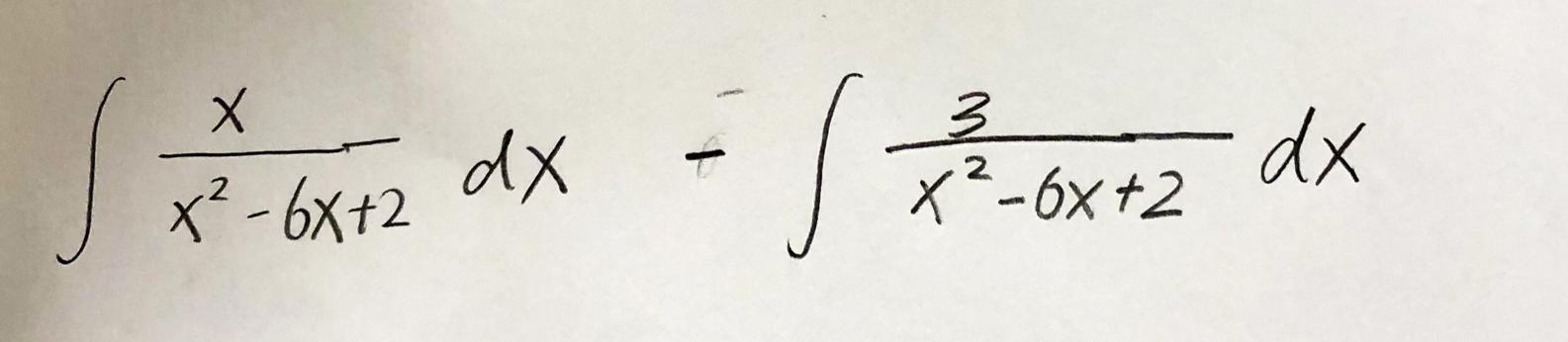 Du skriver att nämnaren n(x)= x2 -6x+2 saknar rötter och får krångel. Men n(3)=-2 och n(10)=42 och n(x) är kontinuerlig i hela R medför att den måste ha minst ett nollställe. Kör pq.