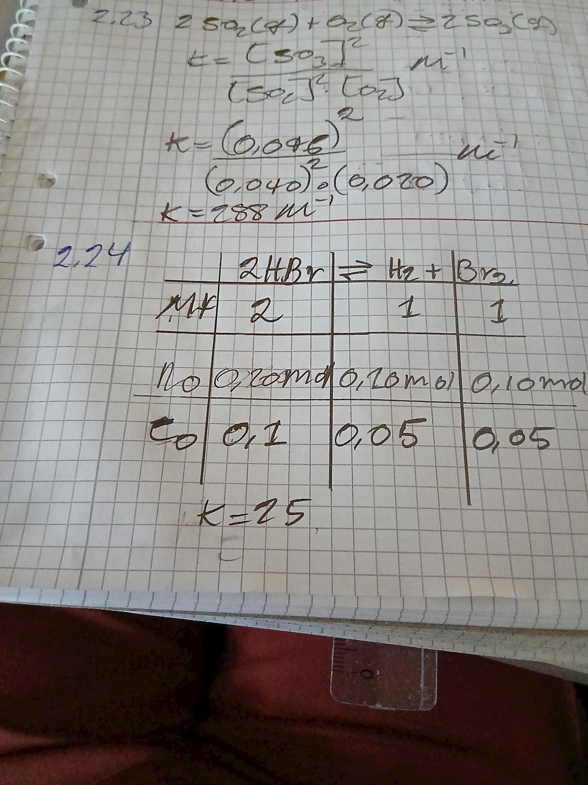 1. Börja med att vända på uttrycket för jämviktskonstanten: K=produkter/reaktanter. (I uppgift 2.23 som jag ser skymta överst på ditt papper har du ju gjort rätt.)