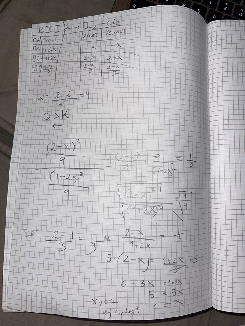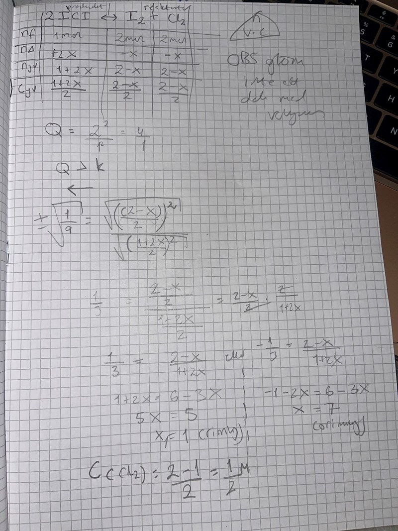 När en behållare med volymen 2,0 dm^3 fylls med 1,0 mol ICI, 2,0 mol Cl2 och 2,0 mol I2 inställer jämvikten 2ICI -><- I2 + Cl2