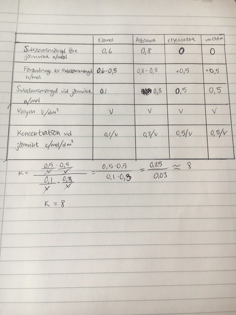 Man blandar 0,6 mol etanol med 0,8 mol ättiksyra. Sedan jämvikt ställt in sig finner man att det bildats 0,5 mol etylacetat och 0,5 mol vatten. Beräkna jämviktskonstanten för reaktionen.