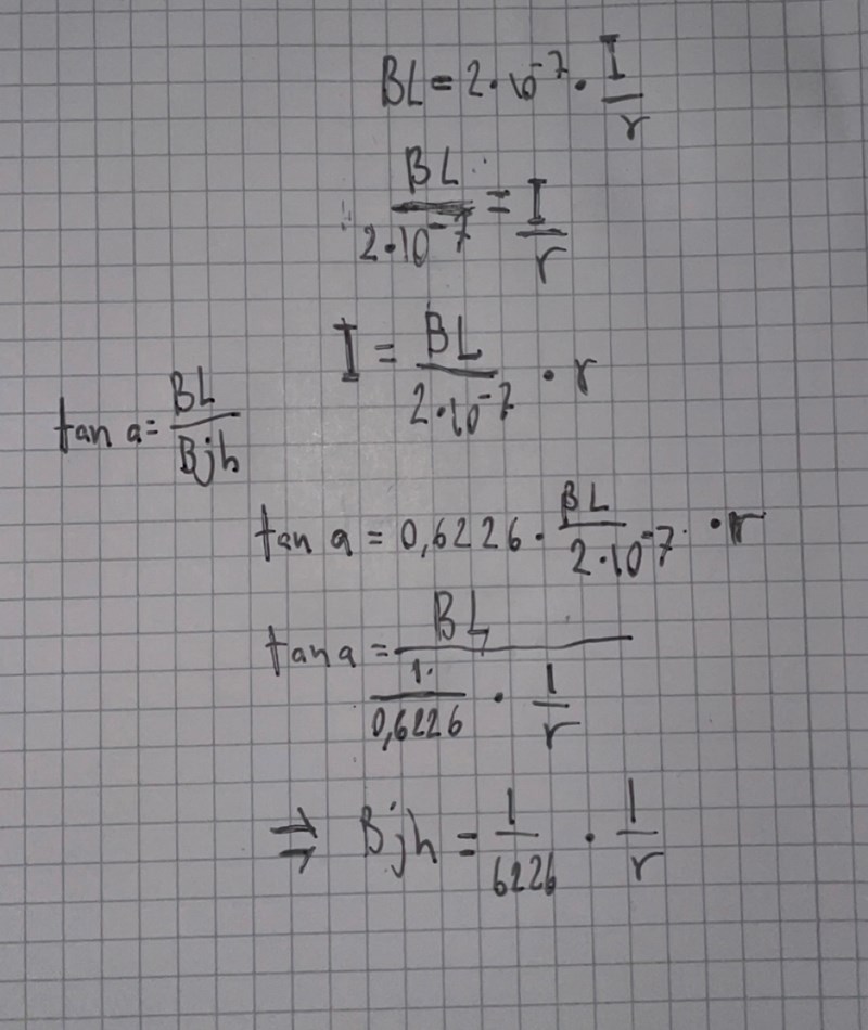 Bi är magnetfältet från ledaren. Med lite trigonometri blir ju då tan(a) = Bi / Bjh som är en rät linje med rikningskoefficienten....