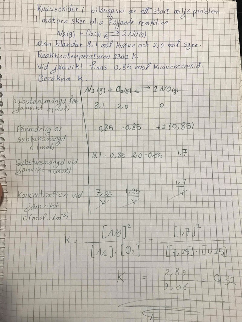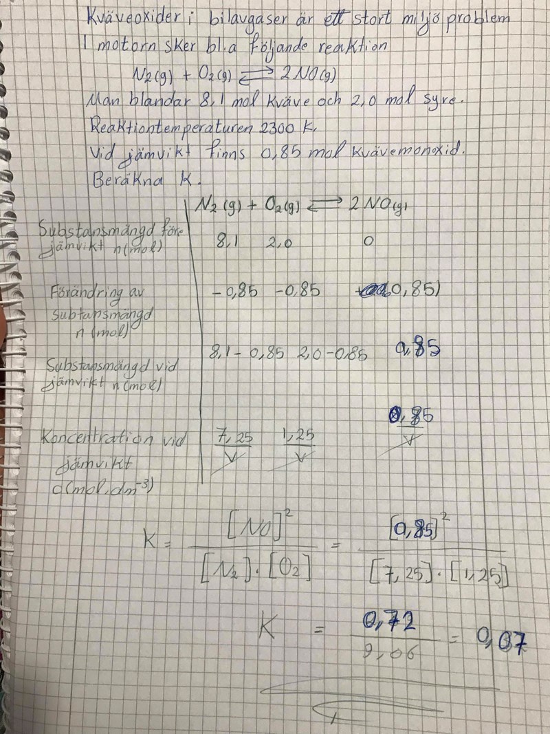 Nu bildas ju 1,7 mol NO vid jämvikt, inte 0,85 mol som det står i uppgiften!