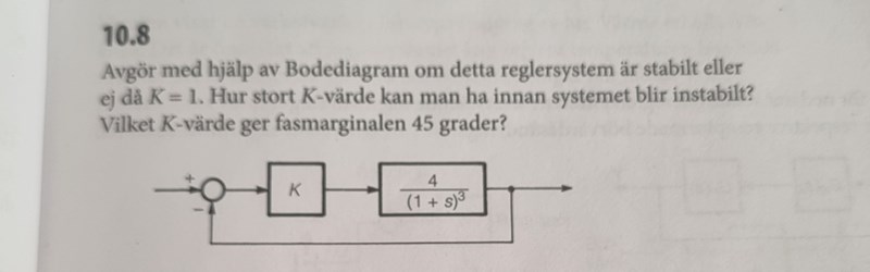Jag har gjort allt i uppgiften förutom beräkningen av k värde så fasmarginalen blir 45 grader. Tycker jag har testat allt men jag får fel värde. Någon ledtråd så man kan komma på rätt väg?