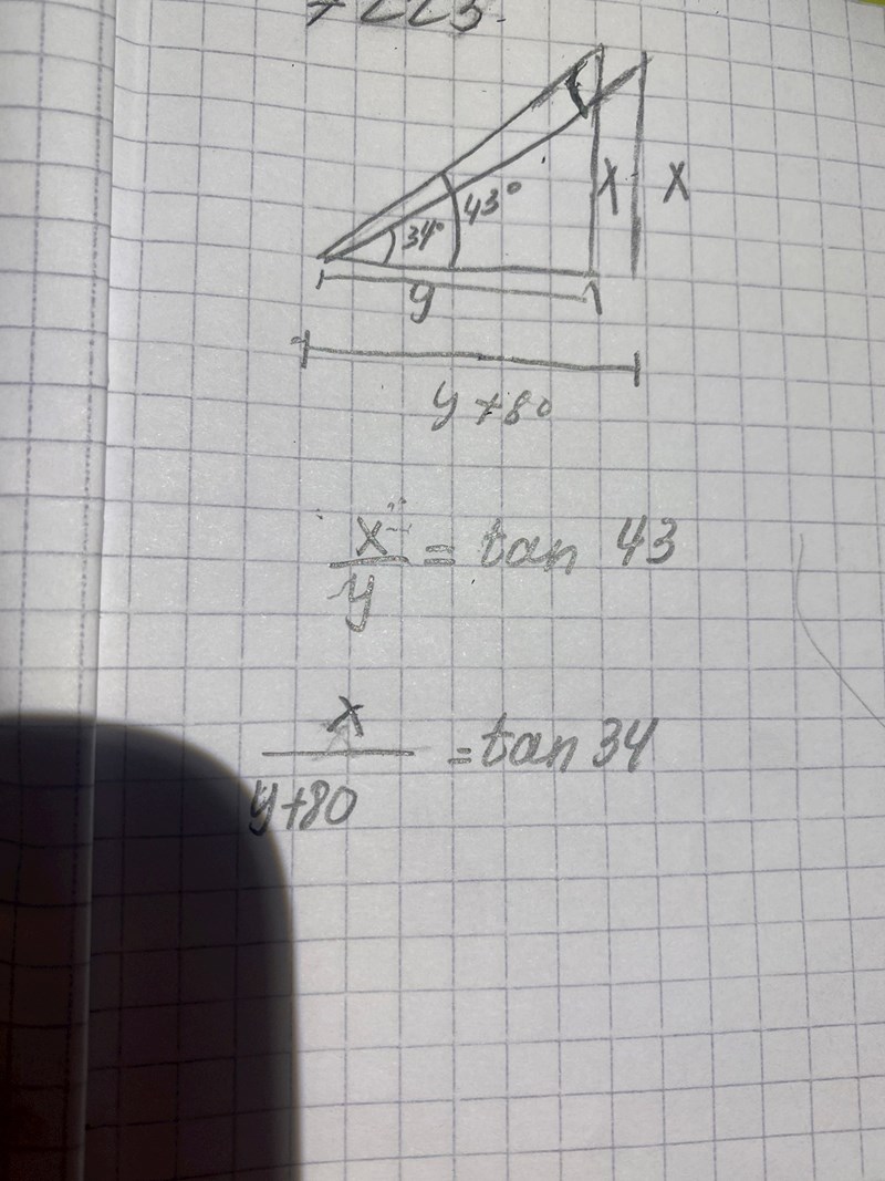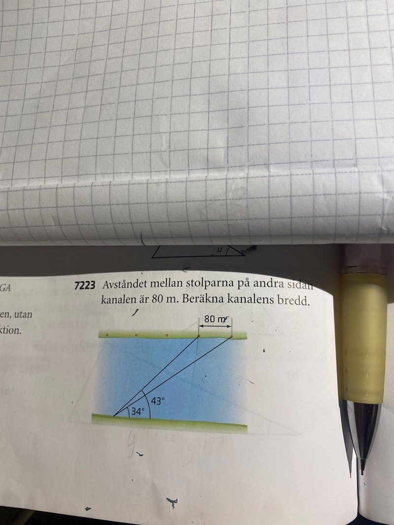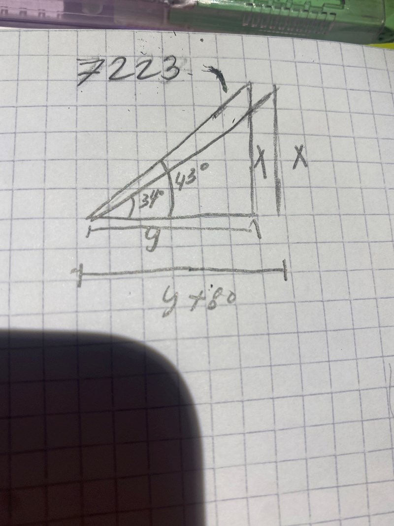 Jag har en uppgift som jag inte vet vart jag ska börja. Jag började med att namnge den motstående kateten till vinklarna 34 och 43 till x, men jag vet inte om det var nödvändigt.