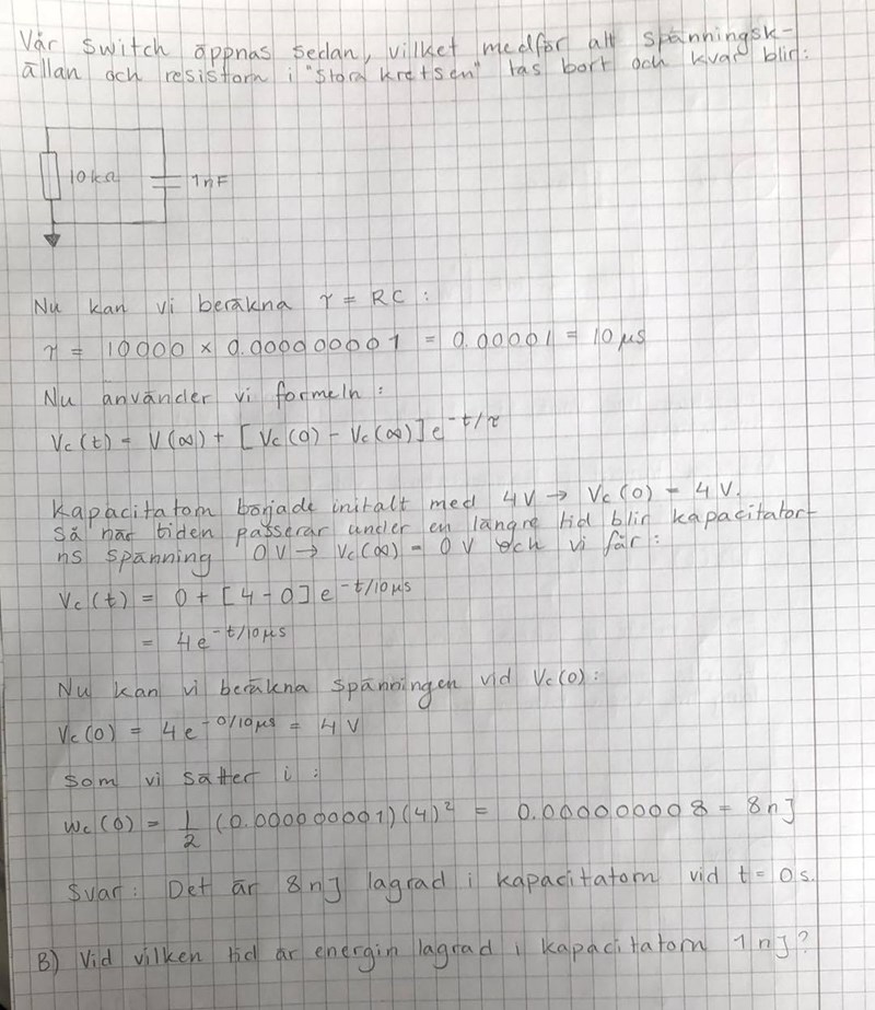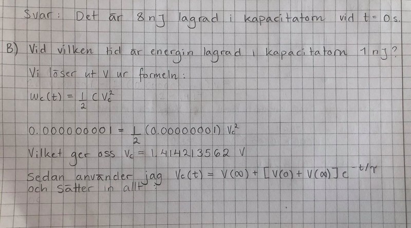 Jag måste fråga om fråga B) vid vilken tid energin i kapacitatorn är 1 nJ. Jag tänkte att jag skulle beräkna fram det ur formeln jag hade, men det finns ju ingen okänd tidsvariabel. Jag har inte sett någon annan formel för energi lagrad i kapacitatorn. Har du något förslag på hur man ska ta sig fram?