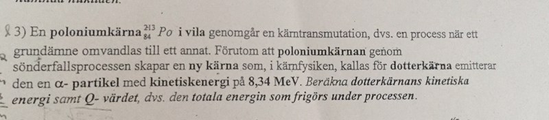 Så din lärares ledning hintar att du ska räkna ut alfapartikelns rörelsemängd. Jag tycker att man kan göra det då. Då har man också atomens rörelsemängd. Och då kan man räkna ut atomens energi.