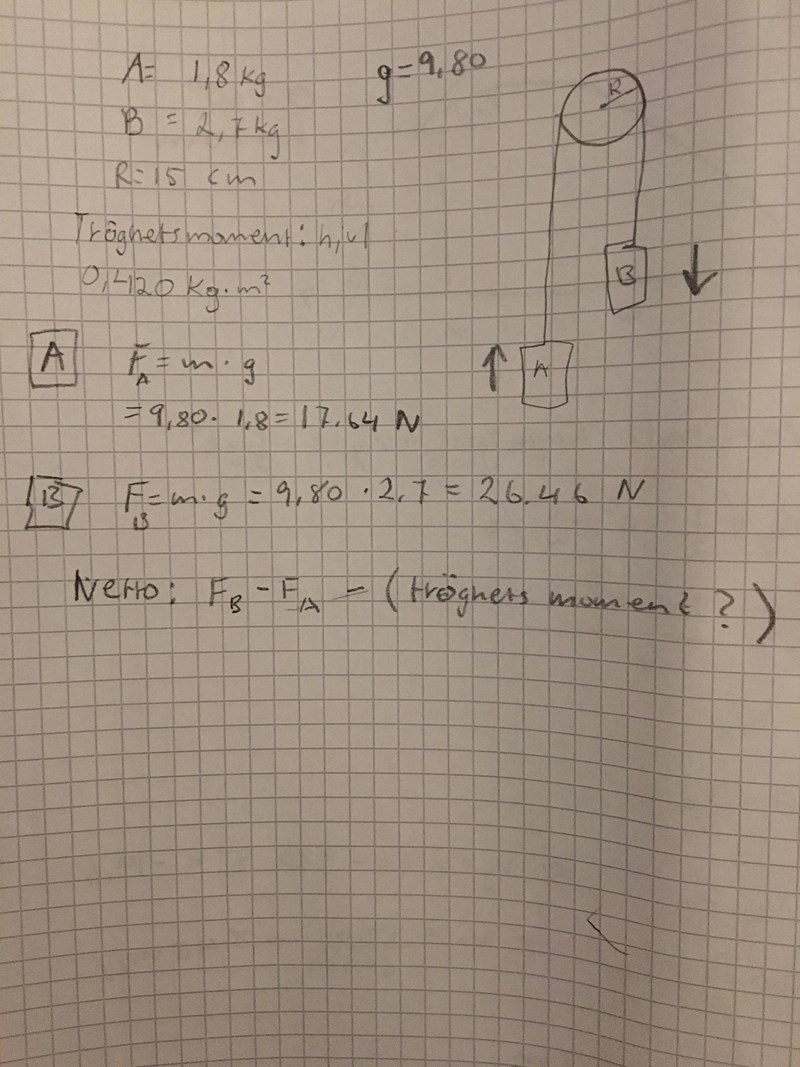 Vet ej hur jag kommer vidare här, jag har beräknat ut krafterna på båda klossarna, men sedan försvinner det väl en del för att hjulet har ett tröghetsmoment.