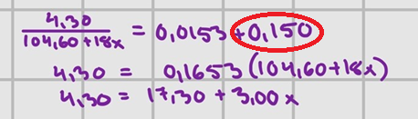Sedan har du ställt upp ekvationen som jag tipsade om i en tidigare fråga. Den bygger på att substansmängden natriumkarbonat är densamma medan molmassan varierar. Det är ett annat sätt att lösa samma problem.