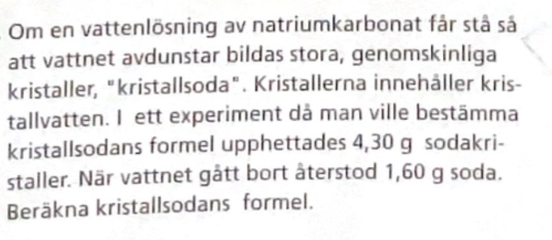Likt ett ev mina tidigare inlägg, försökte jag beräkna koefficienten för kristallvatten i ett salt, denna gången natriumkarbonat. Jag får dock inte till det av någon anledning, gissningsvis för att jag gjort något fel i min ekvationsräkning, men hittar inget som är fel, så kan vara att själva ekvationen jag ställt upp är fel.