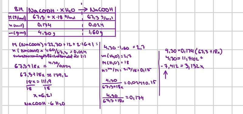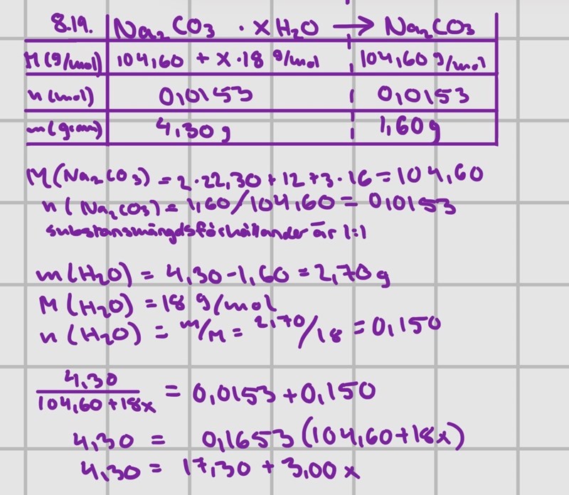 Alt.1. När man räknat ut substansmängden för Natriumkarbonaten och vattnet ställer vi sedan upp ett förhållande mellan substansmängderna för att veta hur många vattenmolekyler som "får plats" i 0,0153 mol Natriumkarbonat. Då får vi att x≈9,8 vilket ger oss att koefficienten för mängden vatten ska vara 10.