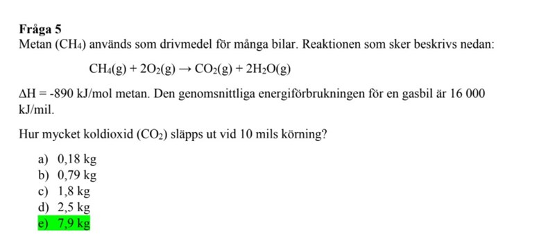Du borde ha med en rad om att 1 mol metan ger 1 mol koldioxid också (fast det behövs ju inte i det här fallet, när man bara skulle välja rätt alternativ). För övrigt: Tydligt och bra!