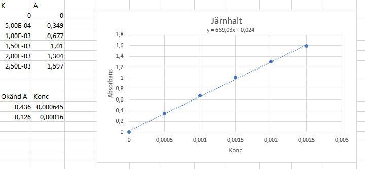 Kan även notera att koncentrationen på de okända absorbanserna räknades ut genom uträkningen (0,436-0,024)/639,03=0,00645 och likadant för absorbansen 0,126 för att då lösa ut x.