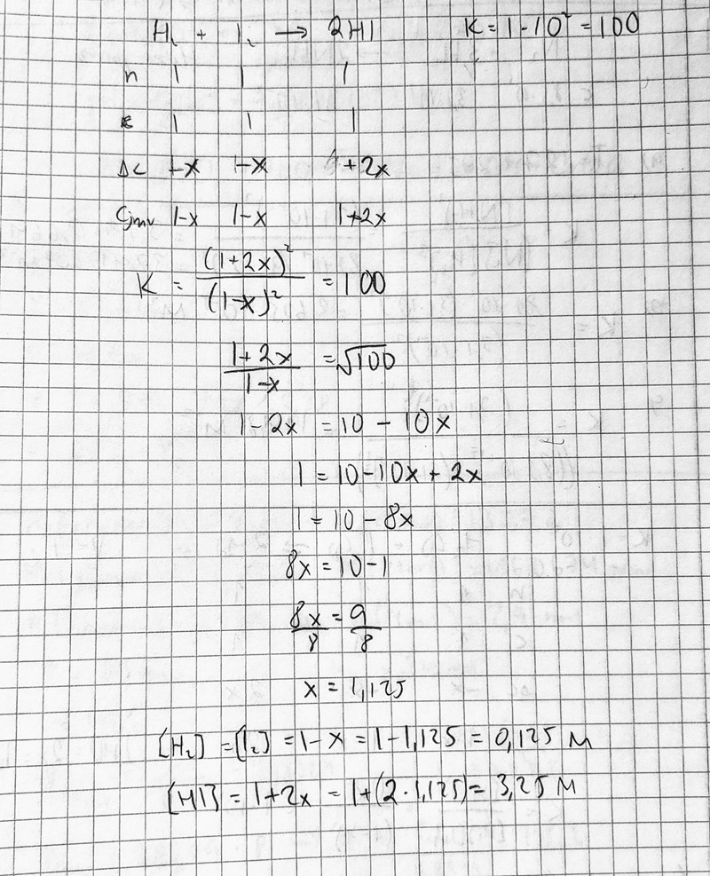 Frågan: At a particular temperature, K= 1.00*102 for the reaction: H2(g) + I2(g) 2HI(g). In an experiment, 1.00 mole of H2, 1.00 mole of I2, and 1.00 mole of HI are introduced into a 1.00-L container. Calculate the concentrations of all species when equilibrium is reached.