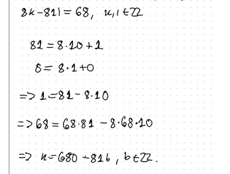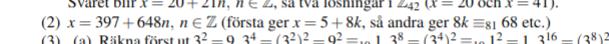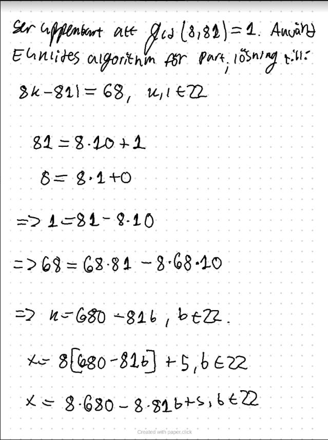 Jag vill lösa , eftersom jag vill hitta i Z81. Jag får partiulärlösningen och eftersom 680, 81 är relativt prima ges alla lösningar till av där b är något heltal.