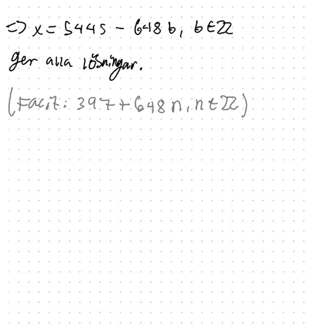 Nämnvärt att denna del av lösningen (att x=konstant+648b), stämmer överrens med facit. Det är bara ”konstant” som jag får fel på.