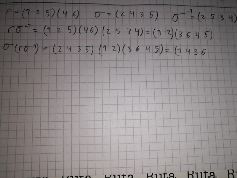 Hej! Jag har en uppgift var jag ska räkna ut konjugatet av två permutationer = (1 2 5)(4 6) och = (2 4 3 5) (i ). Jag har dock fastnat på sista delen av min uträkning och får ett nonsens svar. Förstår inte var jag har gjort ett fel.