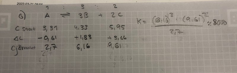 Hej! Jag har försökt lösa denna uppgift men får det inte K till 4,5*10^3 som är rätt svar. Vad gör jag för fel?