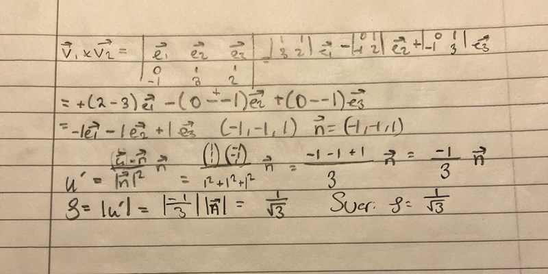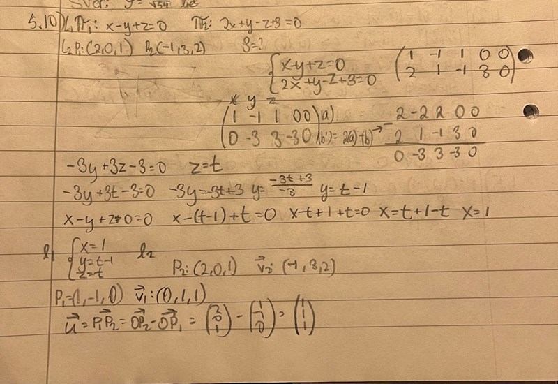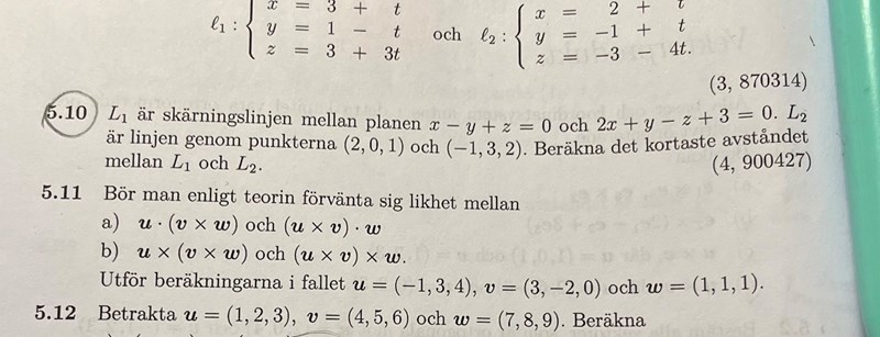 Hej! Jag har fastnat på uppgift 5.10 där man ska bestämma avståndet mellan L1 och L2. Jag började med att lösa ut ekvationssystem för Plan 1 och 2 och därefter försökte jag komma fram till vad som var P1, P2 och V1 V2. Jag är dessutom osäker på om jag gjorde Gauselimination rätt så felet kan även finnas redan där.