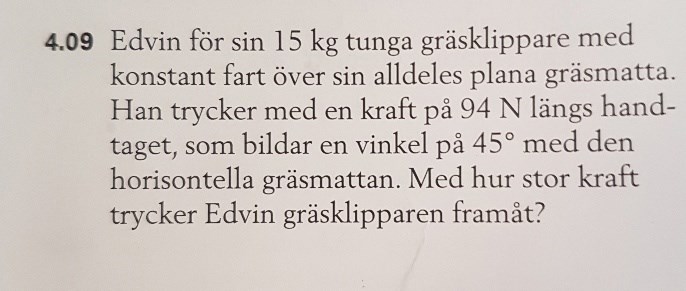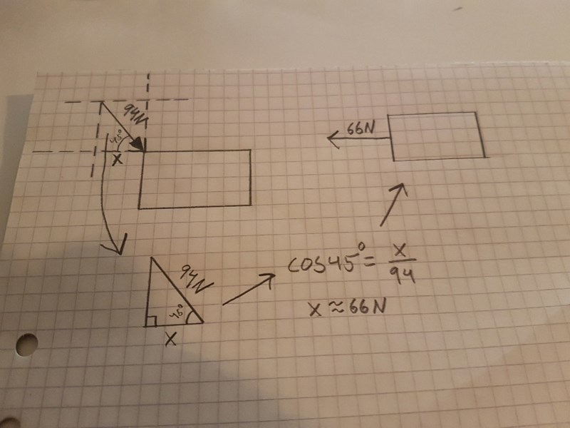 Har kommit fram till ett svar nu , jag utgick ifrån att motstående katet mot 45-vinkeln inte behövdes beräknas då den beräkningen hade varit normalkraften, vilken tas ut av gravitationskraften, kan någon bekräfta att jag tänker rätt ? Sedan tänker jag att det är friktionen jag kom fram till med 66N bakåt, och att kraften frammåt ska vara lika för att resultanten ska bli noll (om den nu ska det affe :-) ) ??