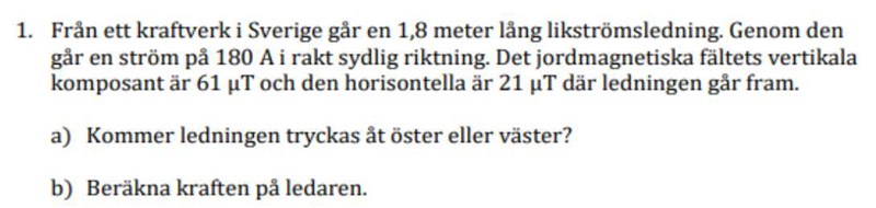 B = Om jag förstått det hela rätt ska jag använda magnetfältets komposant som är vinkelrät mot strömriktningen då den komposant som är parallell med strömriktningen inte påverkar. Därmed tänker jag att B blir den horisontella komposanten, d.v.s. 21 , är det korrekt?