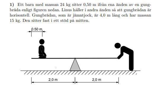 Jag måste väl ändå lösa ut vilken kraft som appliceras från personen som trycker ned gungbrädan då det är olika avstånd till vridpunkten från pojken och personen som trycker ned stödet?