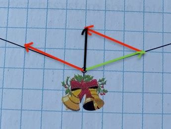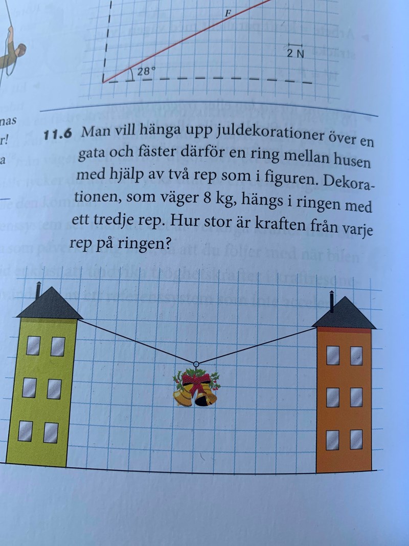 Man vill hänga upp juldekorationer över en gata och fäster därför en ring mellan husen med hjälp av 2 rep som i visad figur. Dekorationen, som väger 8kg, hängs i ringen med ett tredje rep. Hur stor är kraften från varje rep på ringen?