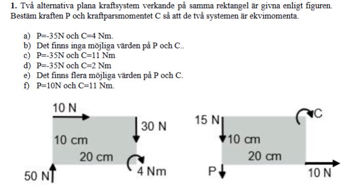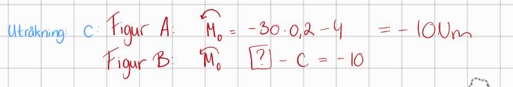 Enligt facit ska C = 11Nm. På så sätt ska mitt [?] alltså vara 1. Förstår inte hur det här tas fram. Är det så simpelt att man tar 10x0,1? Inte så skarp på hur det fungerar med momentsummor! Jag räknar map vänstra översta hörnet moturs. Tack på förhand!