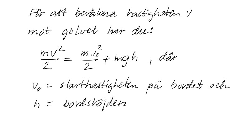 Frågan lyder: En kula rullar över kanten på ett 0.95 m högt bord. Kulan träffar golvet 1.10 meter ifrån bordskanten, mätt längs golvet.