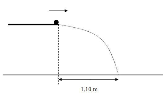 På en viss höjd över golvet befinner sig en horisontell bordsskiva. En liten kula med massan 100 g rullar över kanten och träffar golvet 1,10 meter från bordskanten. Falltiden från bordet till golvet är 0,2 s. Beräkna kulans rörelseenergi omedelbart innan den träffar marken.