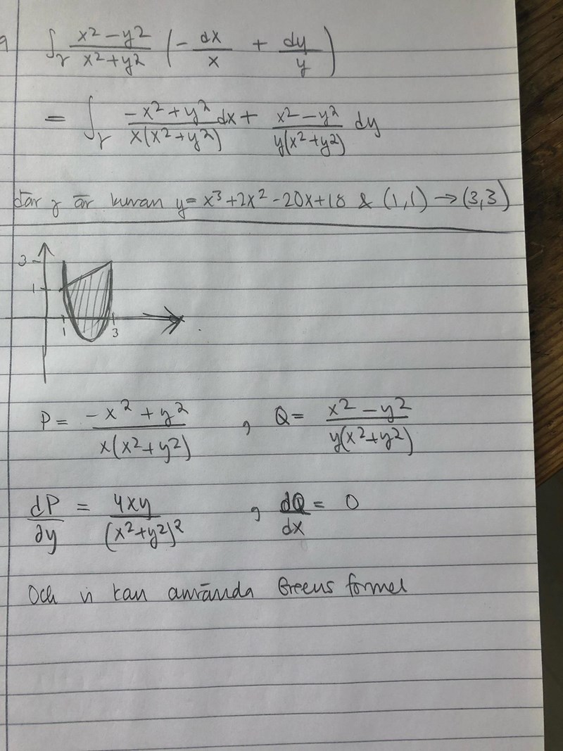 Men jag kommer fastna med vilka gränser jag ska ha i mina två integraler. ena kommer ju iallfall vara men den andra, hur ska man göra då? OM man vill lösa denna med Green (vilket man borde kunnagöra eftersom vi inte är i någon singularitet, och det är ett slutet område)