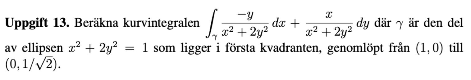 Hej! Behöver lite hjälp med denna fråga, förstår inte riktigt hur jag kan förenkla uttrycket så att jag på ett enklare sätt kan räkna ut kurvintegralen. Har försökt räkna ut Jacobimatrisen men den blir inte symmetrisk (vet ej om det är för att jag räknat fel eller om fältet faktiskt inte är konservativt) och har väldigt svårt att derivera parametriseringen. Tack på förhand!