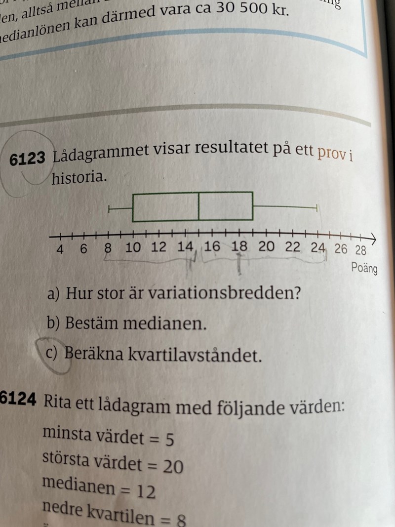 Jag skulle behöva lite hjälp när det gäller att förstå det här med statistik, exempelvis i 6123c), såsom jag tänker skulle ju den nedre kvartilen vara i spannet från 8-14 och den övre kvartilen 24-18 (18-24 vilket man nu skriver)