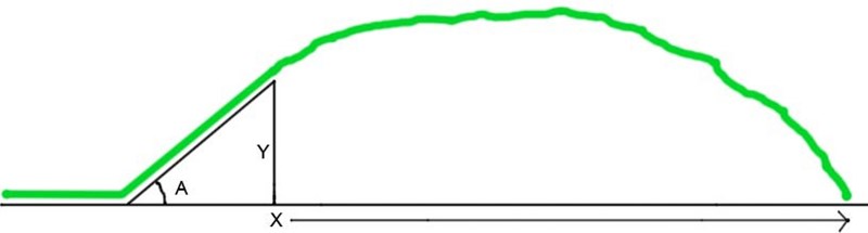 Om man åker på plan mark med en konstant hastighet av "Z" meter/sekund, och sedan åker upp för en backe med bibehållen hastighet där backens topp är "Y" meter hög där backen slutar tvärt. Backen har lutningen "A" . Objektet som färdas väger "M" kg. Hur räknar man ut hur många "X" meter bort man kommer landa från backen (om man bortser från luftmotstånd)?