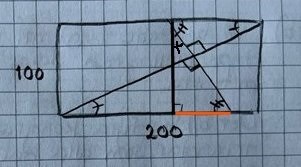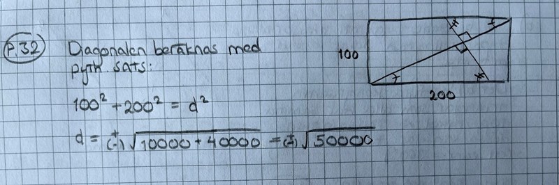 På bilden syns hur åkern ska se ut samt starten på mina uträkningar. Jag ser att det bildas två kongruenta trianglar i åkern + jag kan räkna ut diagonalens längd. Men linjen jag är intresserad av är den andra linjen i rektangeln, som går vinkelrät genom diagonalen. Hur kan jag beräkna denna? Finns det någon användbar sats jag missar? Tack!