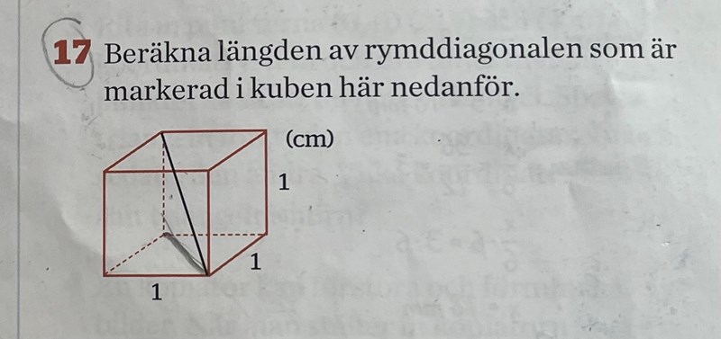 Hej! Jag har fastnat på den här frågan i min mattebok och vet inte riktigt hur jag ska räkna ut den. Jag förstår att man borde använda pythagoras sats men jag förstår inte på vilket sätt?