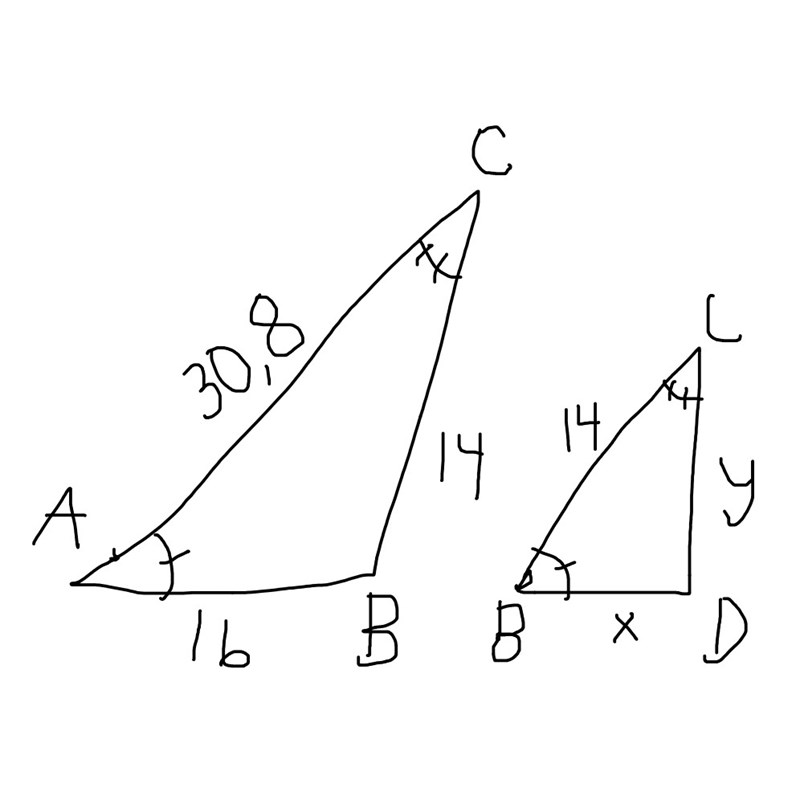 Triangel ABC är likformig med triangel BDC eftersom vinkel A och vinkel B är lika stora och de båda delar vinkel C (och de har även samma vinkel hos respektive triangels sista hörn pga vinkelsumman i trianglar). Triangel ABC har sidorna 16, 14, 30,8 och och BDC har sidorna x, y, 14. Använder vi likformighet så får vi att 16/30,8 = x/14 och då x=(14*16)/30,8 = 7,3 cm. För y får vi att 14/30,8 = y/14 och då y=(14*14)/30,8 =6,4 cm