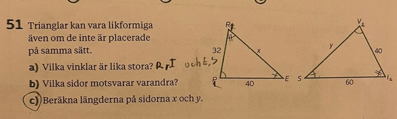 Jag behöver hjälp med uppgiften 51c(ignorera siffrorna som jag har skrivit bredvid vinklarnas bokstäver)