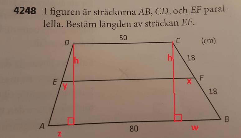 Du har lösningen i din bild Och i punkt 1 och 2. z+w=30, w=2x och z=?, EF=50+....Kommer du vidare? Då har du utnyttjat att CF=BF och DE=AE samt transversalsatsen.