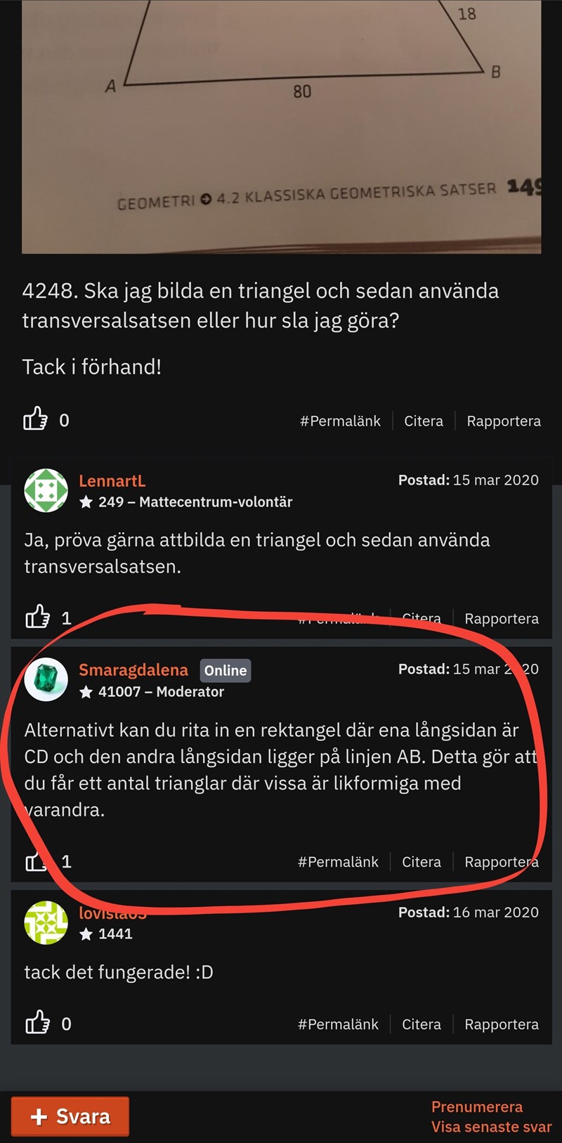 Okej då. Men hur löser jag uppgiften om vi bortser från detta. För kapitlet handlar främst om topptriangelsatsen, bisektrissatsen och transversalsatsen
