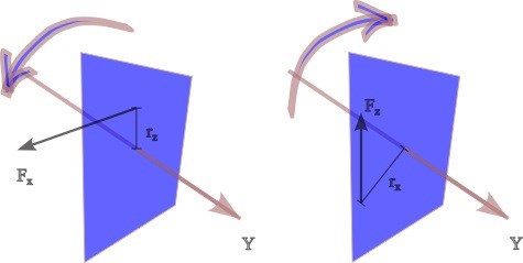 τ·y^=rzFx-rxFz\mathbf{\tau}\cdot \hat{y}=r_zF_x-r_xF_z