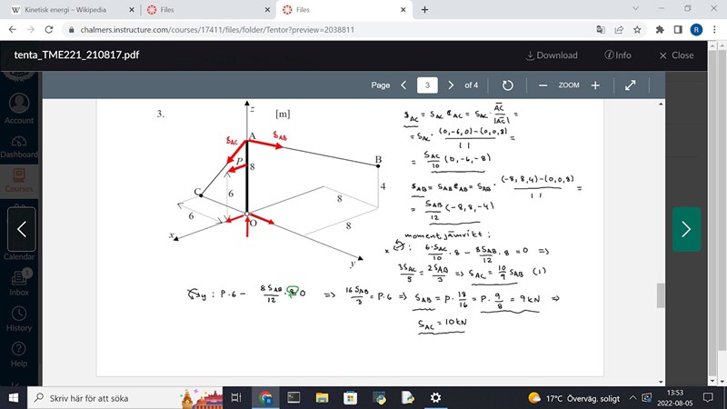Det som jag undrar är varför man multiplicerar Sab med 8 två gånger när man beräknar dess moment runt y axeln (gröna inringade området)? Lite svårt att se men det skall se ut såhär: P·6-8SAB12·8=0